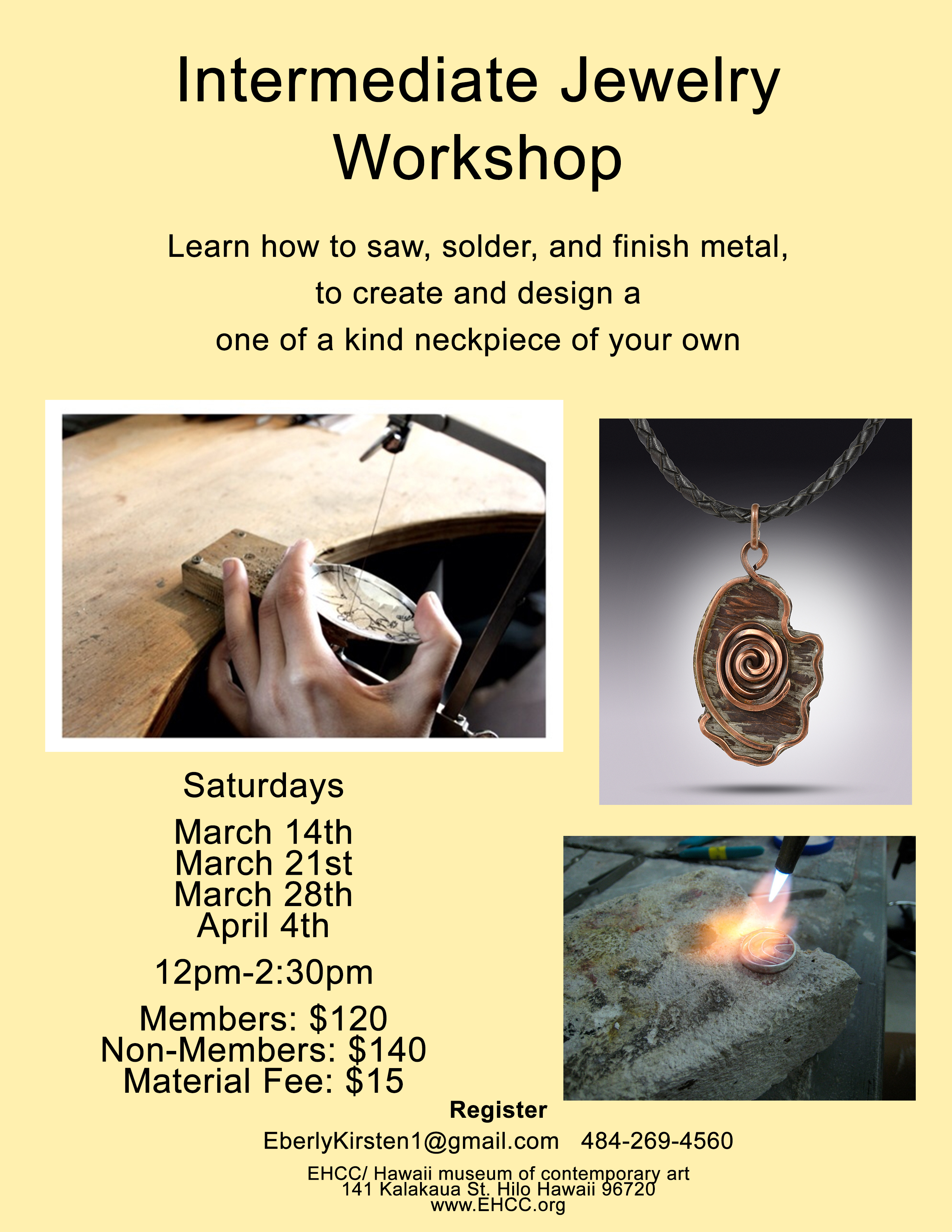 Program type Workshop Dates Saturday, March 14, 2015 - 12:00pm to Saturday, March 14, 2015 - 2:30pm Saturday, March 21, 2015 - 12:00pm to Saturday, March 21, 2015 - 2:30pm Saturday, March 28, 2015 - 12:00pm to Saturday, March 28, 2015 - 2:30pm Saturday, April 4, 2015 - 12:00pm to Saturday, April 4, 2015 - 2:30pm Poster & Flyer